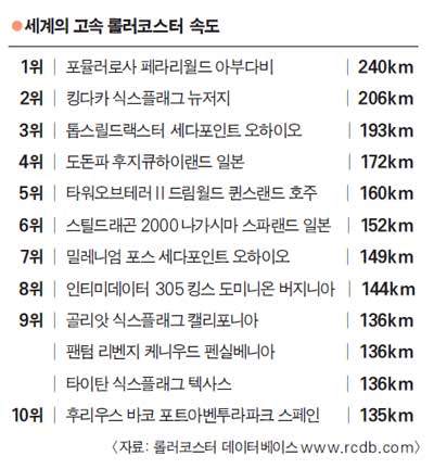 최근 세계 테마파크계의 가장 큰 관심이 집중된 곳은 아랍에미리트 아부다비의 '페라리월드'다. 지난해 말 문을 연 페라리월드는 세계적 명차 페라리를 테마로 한 공원이다. 페라리월드는 45m 높이의 건물에 20만㎡ 넓이의 자동차 모양 붉은색 지붕이 얹혀져 있다. 이 안에 세계에서 가장 빠른 롤러코스터 '포뮬러 로사'가 있다. 최고 시속 240km까지 나오고 최고 70도까지 꺾이는 트랙을 2km가량 달리는 어트랙션이다. 관람객은 포뮬러 로사를 통해 F1의 속도감을 체험한다. 페라리 F1머신을 빼닯은 차량에 탑승한 뒤, 가공할 속도를 견뎌낼 고글을 착용하고 출발을 기다린다. 급가속한 기구가 정지상태에서 시속 240km에 도달하는 시간은 4.9초. 마치 발사된 대포알에 걸터앉은 느낌이다. 전체 2km 길이를 70번 급커브를 틀어가며 통과한다. 차량 1대에 4명씩 타고, 그 차량 4대가 하나로 연결돼 한번에 16명씩 이용할 수 있다.
