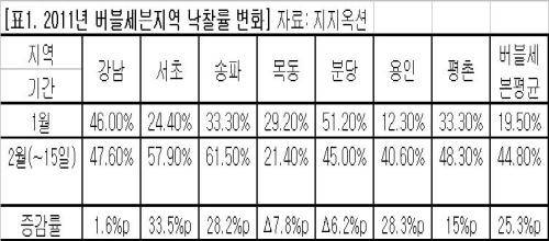 20일 부동산경매 전문업체인 지지옥션에 따르면 이달 15일까지 경매시장 결과를 분석한 결과 강남, 서초, 송파, 목동, 분당, 용인, 평촌 등 버블세븐 지역 아파트 평균 낙찰률이 전월 대비 25%p급등한 것으로 나타났다. 강남구에서는 고가의 아파트가 감정가를 넘어 낙찰된 사례도 발견돼 한동안 숨죽이던 버블세븐이 다시 꿈틀거리는 것으로 보인다.