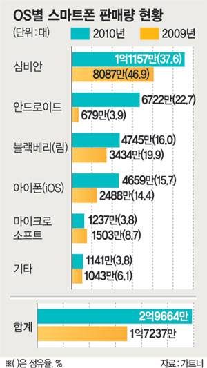 시장 조사기관 가트너에 따르면 안드로이드폰은 지난해 1·4분기 521만대, 2·4분기 1060만대, 3·4분기 2050만대를 기록한 데 이어 지난해 4·4분기에는 3290만대가 판매됐다. 지난해 4·4분기 노키아(심비안)는 3100만대의 스마트폰을 판매해 구글 안드로이드폰에 1위 자리를 내줬다.