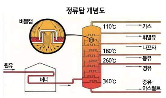 원유의 주성분인 탄화수소는 증류해 분리시킬 수 있는데 탄화수소의 끓는 점이 각기 다른 특성을 이용해 원유에서 휘발유ㆍ등유ㆍ경유유분 등 주요 성분을 분리해 뽑아내게 된다. 이때 원유를 가열하면 끓는 점이 낮은 것부터 차례로 증발해 기화되며 이것을 식혀 차례로 용기에 담는 식이다.