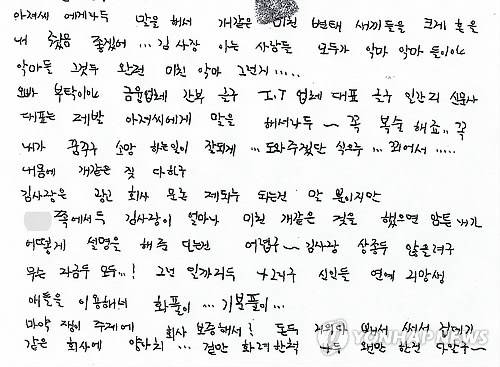 또 장씨가 자살하기 일주일 전 작성한 것으로 보이는 친필 편지에는 본인의 `피해사례'라고 언급한 부분에서 "2008년 9월경…룸싸롱 접대에서 저를 불러서…잠자리 요구를 하게 만들었습니다. 그후 몇개월후 김○○ 사장이…만들어 룸싸롱에서 술접대를…"라고 적혀 있었다.