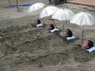 한여름 백사장에서 모래찜질을 하는 것과 비슷하다. 얇은 유카타 하나를 걸치고 모래 위에 누워있으면 온천 관리인이 삽으로 모래를 퍼선 몸을 덮어준다. 온몸으로 묵직한 모래 무게를 버티고 있으면 5분도 지나지 않아 이마엔 굵은 땀방울이 맺히기 시작한다. 숯가마에 들어앉아있는 듯 온 몸에서 땀이 솟는 게 느껴진다. 15분 정도가 적당한 시간이다. 더 누워있다가는 화상을 입을 수 있다. 모래찜질이 끝나면 모래 묻은 유카타를 입은 채 바로 옆에 마련된 온탕에 들어가 모래를 씻어낸다. 시원한 바닷바람을 맞으며 온탕에서 땀과 모래를 씻어내는 재미도 즐길 만하다.