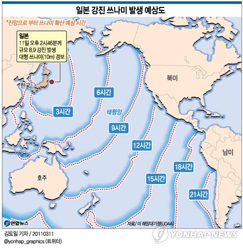 (서울=연합뉴스) 한승호 기자 = 일본 강진이 대규모 피해를 몰고온 가운데 지진의 안전지대가 아닌 한반도는 지진해일(쓰나미)을 대비할 시간마저 100분에 불과한 것으로 나타났다.