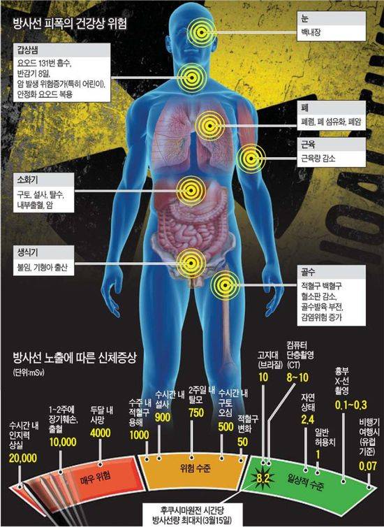 ● 방사선이 인체에 미치는 영향방사선 노출 15분 내 복용 땐 90% 예방DNA변이로 癌유발ㆍ기형아 출산…500mSv 노출 땐 백혈구감소증비 피하고 방독면으로 유사시 대비…노출 됐다면 옷 벗어 밀봉 후 폐기