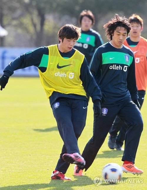 (파주=연합뉴스) 진성철 기자 = 23일 경기도 파주NFC(축구대표팀트레이닝센터)에서 열린 축구국가대표팀 훈련에서 기성용(왼쪽)과 박주영이 공을 다투고 있다. 축구대표팀은 오는 25일 온두라스와의 친선경기를 갖는다. 2011.3.23