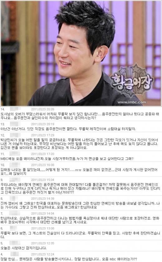 '무릎팍도사'가 음주운전으로 사회적 물의를 일으킨 박상민 출연분을 방송할 예정이자 누리꾼들은 해당 게시판을 "오늘은 시청대신 잠자기입니다" "문제 많은 사람을 방송출연시키다니, 요즘 MBC 왜 이러는가?" "오늘 시청거부하겠음" "무릎팍 제작진이여 소탐대실 하지말자" 등 비난글로 채웠다.