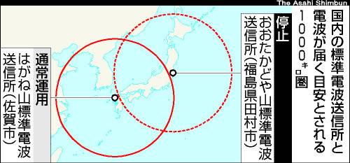 '표준전파' 송신소는 전자시계가 정확한 시각을 자동적으로 보정(補正)하는 역할을 한다. 일본에는 현재 후쿠시마현 다무라(田村)시와 사가현의 사가(佐賀)시에 각각 한개씩 2곳이 있다. 표준전파 송신소에서 내보내는 전파가 안정적으로 도달하는 거리는 1000km. 따라서 이번 대지진 및 쓰나미 피해가 큰 지역에는 표준전파가 잘 도달되지 않아 전자시계 시간이 자꾸 틀리는 또 하나의 재난을 겪고 있는 것이다.