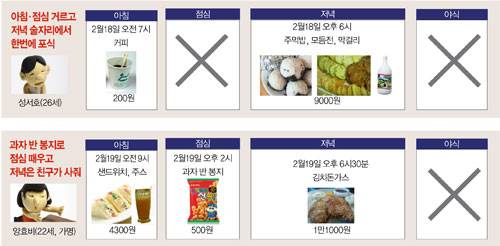 푸짐하게 먹는 경우는 주로 '얻어먹을 때'이다. 그가 자취를 하는 서울 중구 필동 동국대 앞은 장충동 족발로 유명하다. 구제역 파동 이후 소(小)자 메뉴가 2만5000원에서 3만원으로 5000원 올랐다. 소문난 맛집이 집에서 가깝지만 호사를 누릴 기회는 많지 않다. 지난 2월24일, 그는 간만에 포식을 했다. 점심은 지인에게 족발과 부침개를 얻어먹었고 저녁 땐 은사가 과메기와 회를 사주었다. 그는 "자취하면서 얻어먹는 노하우가 생겼다. 더치페이하기 위해 노력해봤지만 그렇게 해선 살아남을 수 없다는 걸 알았다"라고 말했다. 20대들의 식습관이 부실한 것은 일차적으로 먹는 데 쓸 돈이 많지 않기 때문이다. 주머니가 가볍기 마련인 청춘이어서만은 아니다. 점점 오르는 등록금·집세 등 부담이 이들의 식단을 더 쪼그라들게 만든다. 쓸 수 있는 돈이 한정돼 있으니 가장 '만만한' 식비부터 줄이게 되는 것이다.