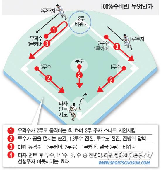 이런 수비를 현장에서 '100% (수비)'라고 부른다. 100% 예외없이, 무조건 3루에 던져서 선행주자를 아웃시키는 게 목적이라서 그렇게 부른다.
