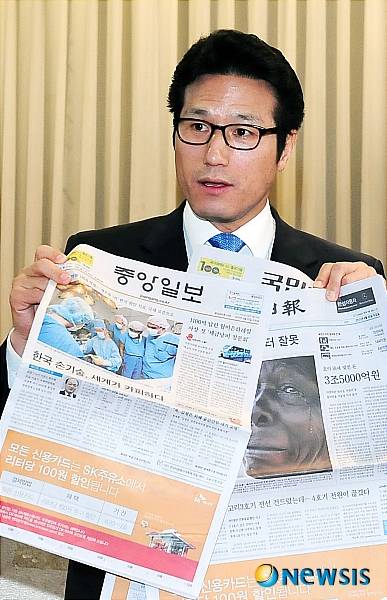 【서울=뉴시스】박동욱 인턴기자 = 정병국 문화체육관광부 장관이 20일 오전 서울 중구 창덕여자중학교 강당에서 3학년 학생들을 대상으로 열린 'Reades are Leaders(신문을 읽으면 리더가 된다)'특강에서 신문을 들고 강연하고 있다.