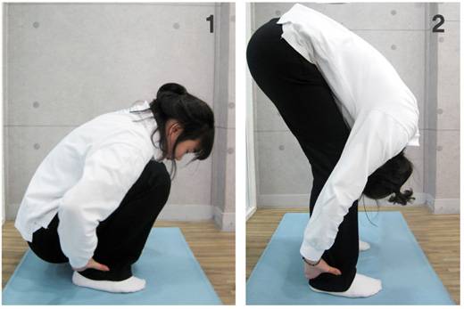 먼저 다리를 어깨 폭보다 조금 넓게 벌리고 선 다음 그대로 주저앉는다. 양손으로 발목 뒤쪽 아킬레스건 부분을 감싸듯 쥐고 무릎은 서로 붙이지 말고 다리 폭과 동일하게 열어둔다.②