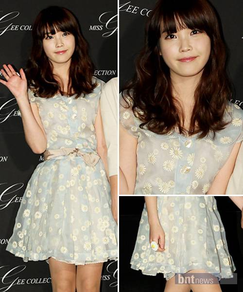 매력녀 아이유는 2011-2012 F/W 서울패션위크 디자이너 지춘희 'MISS GEE COLLECTION'에 화사한 데이지꽃이 전체적으로 프린팅 된 하늘색 시스루룩을 입고 방문했다.