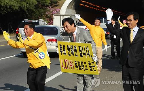 그는 터널로 진입하는 버스와 승용차를 향해 연방 고개를 숙이며 투표 참여를 독려했다. 이어 이봉수 후보와 함께 김해 홍동 대법륜사와 창원 GM대우자동차 등을 돌며 종교계와 노동계의 표심을 붙잡는데 공을 들이는 등 자정까지 강행군이 이어졌다.