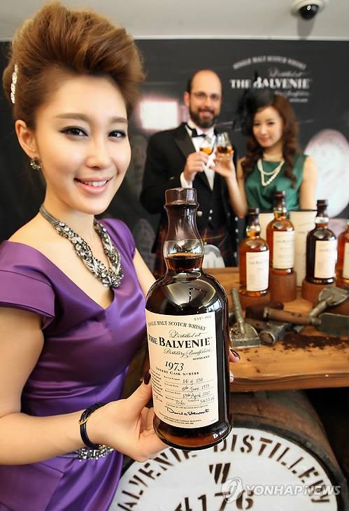 (서울=연합뉴스) 배재만 기자 = 3일 서울 소공동 롯데호텔에서 명품 수제 싱글몰트 위스키 발베니 빈티지 라인및 한정판 싱글몰트 위스키가 선보여 눈길을 끌고 있다. 빈티지 라인이 국내에 공개되는 것은 이번이 처음으로 아시아 싱글몰트 마니아를 위해 만든 '발베니 1973(280만원)','발베니 쉐리 캐스크 1973(290만원),'발베니 1975(250만원)'등 총 3종의 빈티지 위스키와 '발베니 피티드 캐스크 17년'(120병 한정판)까지 총 4종이 선보였다. 2011.5.3