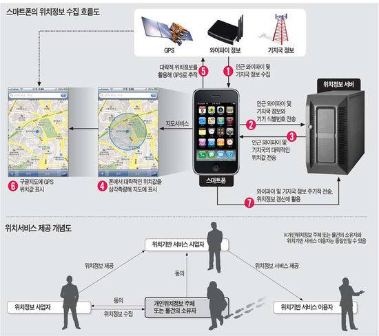 애플과 구글은 스마트폰 플랫폼 사업자로서 위치정보를 수집한다. 인근 맛집,목적지까지 길 안내 등 편리한 위치정보 서비스를 제공하려면 스마트폰의 위치를 파악해 위치기반 서비스 사업자들에게 알려줘야 한다고 보기 때문이다. 애플과 구글은 한국 정부로부터 위치정보 사업 허가를 받았다.