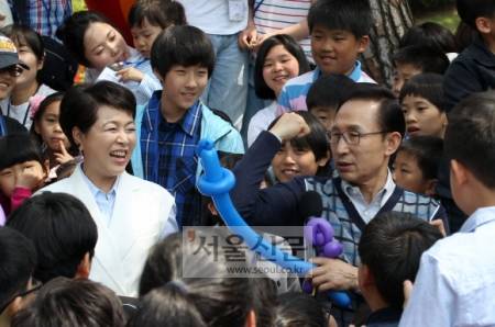 이명박 대통령과 부인 김윤옥 여사가 어린이날인 5일 소외 계층 어린이들을 청와대로 초청해 즐거운 시간을 함께 보냈다. 아이돌 그룹 슈퍼주니어의 멤버 신동과 개그우먼 김신영이 녹지원에서 공동 진행한 행사에서 어린이들은 국방부 군악대와 의장대 연주를 관람한 데 이어 이 대통령 내외와 함께 도자기 만들기, 전통 부채 제작 등의 체험 활동을 하고 질의응답 시간도 가졌다. 또 '명랑운동회' 순서에서는 기차놀이, 짝짓기 놀이 등을 어린이들과 함께 했다.