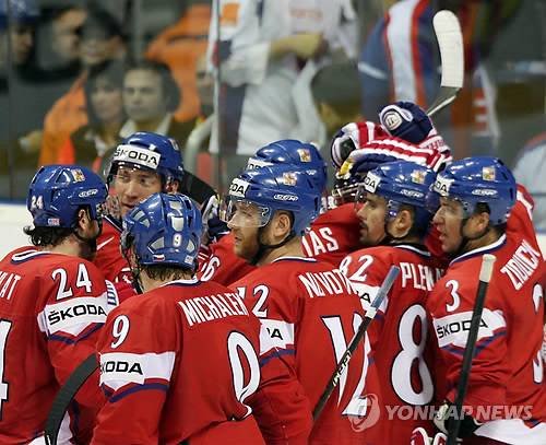 epa02720810 Players of Czech Republic celebrate after they won the Ice Hockey World Championship group E qualification match between Czech Republic and Slovakia at the Orange Arena in Bratislava, Slovakia, 06 May 2011. Czech Republic won 3-2. EPA/PETER HUDEC < 뉴스의 새 시대, 연합뉴스 Live >< 모바일 애플리케이션 >< 포토 매거진 >< 저작권자(c)연합뉴스. 무단전재-재배포금지. >