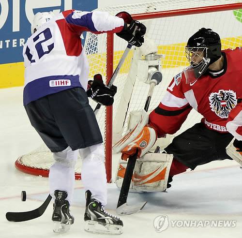 epa02721582 Fabian Weinhandl (R) of Austria vies for the puck with David Rodman (L) of Slovenia during the Ice Hockey World Championship group G relegation match between Austria and Slovenia at the Orange Arena in Bratislava, Slovakia, 07 May 2011. EPA/PETER HUDEC < 뉴스의 새 시대, 연합뉴스 Live >< 모바일 애플리케이션 >< 포토 매거진 >< 저작권자(c)연합뉴스. 무단전재-재배포금지. >