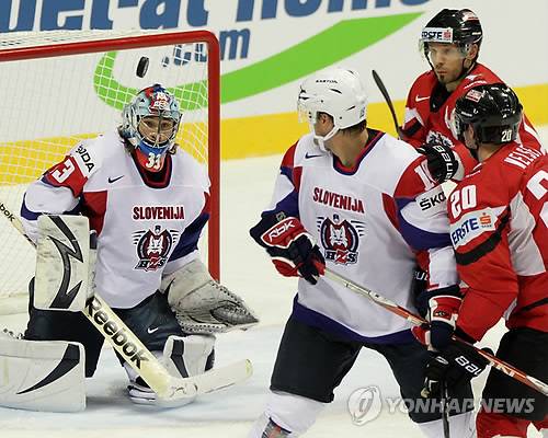 epa02721586 Thomas Koch (top right) and Daniel Welser (bottom right) of Austria vie for the puck with goalie Robert Kristan (L) and Gregory Kuznik (C) of Slovenia during the Ice Hockey World Championship group G relegation match between Austria and Slovenia at the Orange Arena in Bratislava, Slovakia, 07 May 2011. EPA/PETER HUDEC < 뉴스의 새 시대, 연합뉴스 Live >< 모바일 애플리케이션 >< 포토 매거진 >< 저작권자(c)연합뉴스. 무단전재-재배포금지. >