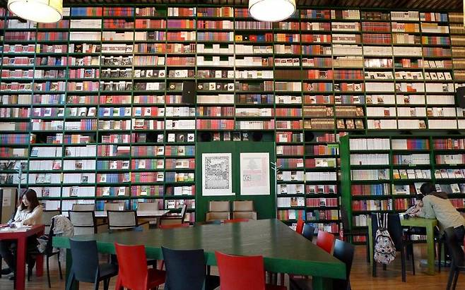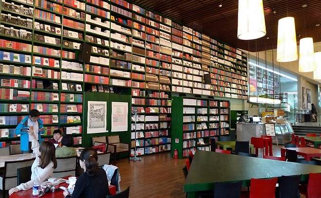 이 책꽂이를 만든 이유는 이 북하우스란 곳이 출판사 한길사에서 운영하는 책방 겸 카페 겸 갤러리이기 때문입니다. 책을 만드는 출판사가 만든 공간이니 책으로 인테리어를 한 것입니다. 누구나 저런 거대하고 화끈한 책꽂이를 상상하기 마련인데, 그걸 실제로 만들어낸 것이죠. 저 20미터 길이 전체를 메운 책은 모두 1만2000권이라고 합니다. 한길사에서 나온 책들을 꽂았는데, 한길사 책들이 두꺼운 것들이 많은 점을 감안하면 거의 2만권은 족히 꽂을 수 있어 보입니다. 한길사에서 저 책꽂이를 만들게 된 것은 김언호 대표의 생각 때문이었습니다. 김 대표는 "책의 바다를 보여주는 책장을 만들면 재미있겠다"는 생각에 일을 저질렀다고 하네요. 정확한 기록은 없지만 단일 책꽂이로는 국내 최대일 것으로 추정됩니다. 저 카페의 이름이 '포레스타'인데, 이탈리아 어로 '숲'이란 뜻이죠. 정말 1만2000권의 책들이 만들어내는 책의 숲이었습니다.