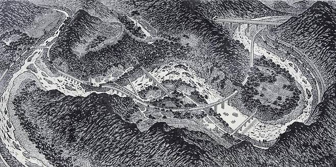 작품 이름은 < 문경 진남교반 > . 문경의 명승인 진남교반은 '경북8경'의 첫번째로 꼽힙니다. 물길이 굽이치며 만들어낸 기암괴석 절벽 위로 옛 다리와 새 다리, 그리고 철교 등이 지나갑니다. 그래서 다양한 길들이 한 곳에 몰려있는 '길 백화점' 같은 곳입니다. 거기에 위로는 성벽도 있습니다. 성벽 역시 길인만큼 온갖 길들이 한곳에 모여 파티를 하는 셈입니다.