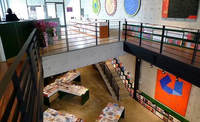 저 카페 공간과 달리 건물 3층까지 올라가는 벽면을 따라 맨 위층까지 이어지는 이 복도 옆 책꽂이는 서점 책꽂이입니다. 각종 책을 파는 공간인데, 책을 따라 완만한 경사로를 올라가는 분위기가 특별합니다. 책을 좋아하시는 분들, 또는 `책꽂이의 로망'을 가진 분들이라면 한번 구경가실만한 곳임에 틀림없어 보입니다.