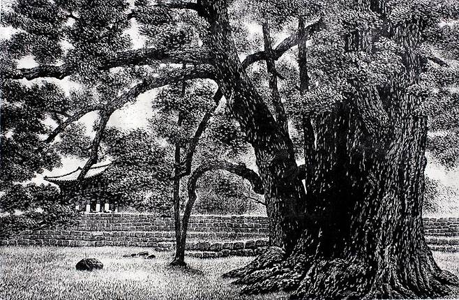 그림을 보시면서 절로 아셨겠듯 김억 작가는 우리 땅 우리 산하를 판화로 담고 있습니다. 직접 답사해서 땅을 체험하고, 그걸 돌아와 판화로 만듭니다. 실제 풍경을 옮기면서도 작가의 해석이 들어간 주관적 풍경으로 재탄생합니다. 그런 점에서 우리 시대의 '진경목판화'라 부를 수도 있겠습니다.