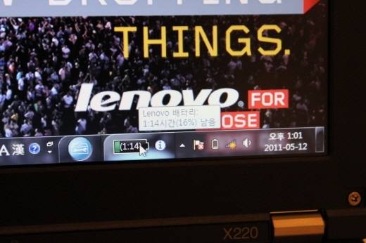 두께나 무게뿐만 아니라 배터리 사용 시간도 따져 봤다. 현장에 전시되어 있던 씽크패드 X220은 시연 때문에 화면 밝기 최대 상태에서 동영상을 계속 재생하고 있었다. 동영상 재생이 끝난 상태에서 배터리는 약 16% 남아 있었고 1시간 14분 쓸 수 있다고 표시되었다.