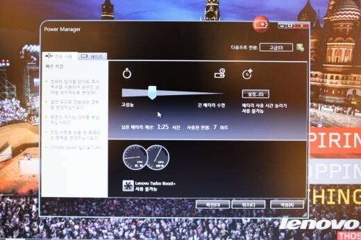 화면에 있는 슬라이더를 '고성능' 쪽으로 끌어 놓으면 보다 높은 성능을 낼 수 있고, 반대로 '긴 배터리 수명' 쪽으로 끌면 배터리 용량을 아끼는 쪽으로 설정된다. 실제로 슬라이더를 '긴 배터리 수명'으로 끌자 화면이 어두워지면서 자동으로 전력 소모가 조절되었다. 자동으로 CPU를 오버클록해 성능을 높이는 '레노버 터보 부스트 플러스'는 배터리 용량이 모자라 쓸 수 없었다.