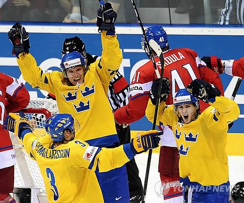 epa02730981 Marcus Kruger (R) of Sweden celebrates with his teammates Oliver Ekman Larsson (L) and Jakob Silfverberg (2nd L) after scoring the 4-1 lead during the Ice Hockey World Championship semi final match between the Czech Republic and Sweden at Orange Arena in Bratislava, Slovakia, 13 May 2011. Sweden won 5-2. EPA/FILIP SINGER < 뉴스의 새 시대, 연합뉴스 Live >< 모바일 애플리케이션 >< 포토 매거진 >< 저작권자(c)연합뉴스. 무단전재-재배포금지. >