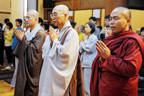 ⓒ뉴시스 법륜 스님(가운데)이 2008년 6월에 열린 '미얀마 사이클론 희생자들을 위한 천도재'에 참석해 기도하고 있다. |