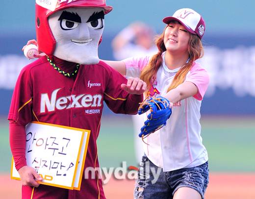 여성그룹 달샤벳 수빈이 15일 저녁 서울 목동야구장에서 열린 '2011 롯데카드 프로야구' 넥센-LG 경기에 시구를 한 후 마스코트 턱돌이에게 안아달라고 했지만 10대라 안기를 거부당하자 기습 키스를 했다.