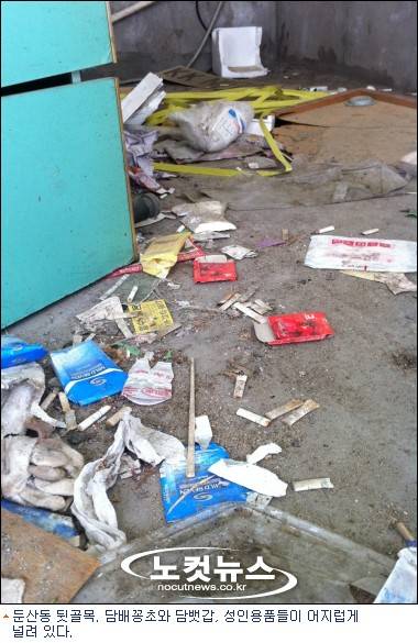 건물과 건물 사이에 은밀하게 숨겨진 이곳 역시 아이들의 '아지트'로 이용된 흔적이 역력했다. 곳곳에 널브러진 쓰레기와 비벼 끈 담배꽁초들이 즐비했다.