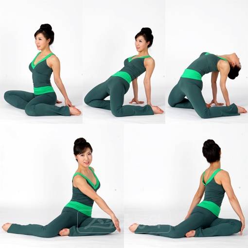4. 숨을 들이마시며 상체를 들어올리고 왼쪽으로 척추를 비틀어준다. 고개도 왼쪽으로 돌린다. 10초 정지 좌우교대 3회 반복.