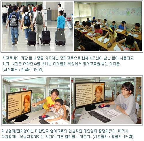 한해 한국인들이 영어교육에 쏟아 붓는 돈만 6 조원이 넘는다(교육기술과학부 자료). 예전에는 부유층 자재들만이 갔던 해외어학연수나 조기유학도 이제는 일반화되어 매 방학마다 수만 명의 학생들이 영어를 배우기 위해 해외로 빠져나간다.