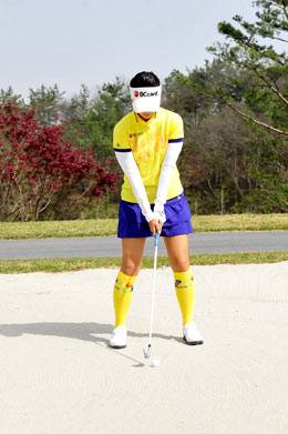 어드레스를 할 때 하체가 무너지지 않도록 발을 모래에 파묻어야 하는데요. 여기서 반드시 기억해야 할 것은 발을 모래에 묻은 만큼 클럽을 짧게 잡아야 한다는 것입니다.