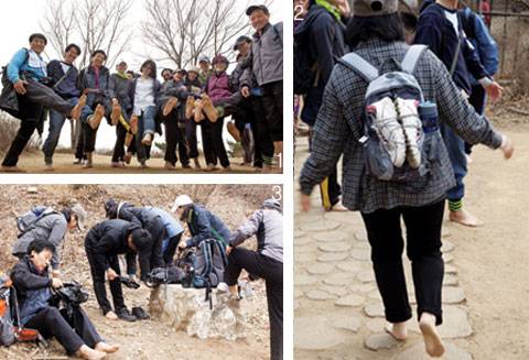 봄기운이 완연한 4월 첫 주말, 파주 심학산 아래 한 무리의 사람들이 모여 있다. 배낭을 멘 차림세로 보아 산악회 회원들이 분명했다. 그런데 사실 심학산은 산악회의 산행지로 삼기에는 규모가 작은 곳이다. 해발 높이가 192m에 불과한 나지막한 산이다. 그러나 이들에게 심학산은 서울 근교에서 찾을 수 있는 몇 안 되는 인기 산행지다. 코스가 부드러워 맨발로 오르기 좋기 때문이다.