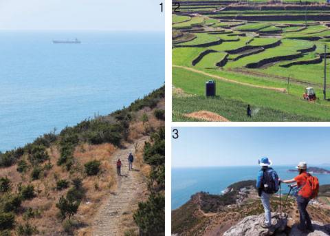 ↑ [월간산]1 범바위로 이어진 해안길. 멈춘듯 천천히 배가 지나고 봄날의 산뜻한 슬로길을 걷는다. 2 읍리 구들장논. 바닥에 구들처럼 돌을 깔고 그 위에 흙을 부어 만든 논이다. 3 범바위 꼭대기에서 본 청산도 앞 바다. 슬로길의 정상이라 해도 좋을 속 시원한 경치가 펼쳐진다. |