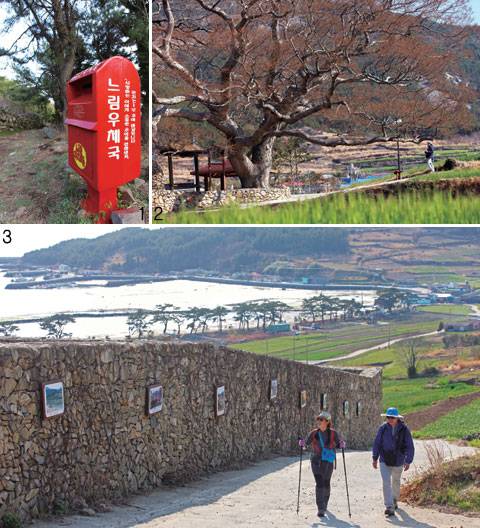 ↑ [월간산]1 1년 후에 배달되는 느린우체통. 슬로길에는 잔잔한 재미가 숨겨져 있다. 2 고인돌길의 200살 된 느티나무. 완성도 높은 예술작품 처럼 균형미 있게 팔을 뻗었다. 3 영화 < 서편제 > 를 찍었던 청산도 돌담길. 빠르게 스쳐보내기에는 아까운 풍경이 널렸다. |