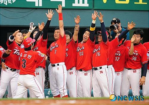 【서울=뉴시스】이동원 기자 = 2일 오후 잠실야구장에서 2011 프로야구 LG트윈스와 KIA타이거즈의 경기가 열렸다. 3회초 KIA공격 1사 2,3루상황 김선빈이 좌측담장을 넘기는 스리런홈런을 날린 후 더그아웃 앞에서 동료선수들과 하이파이브를 나누고 있다.