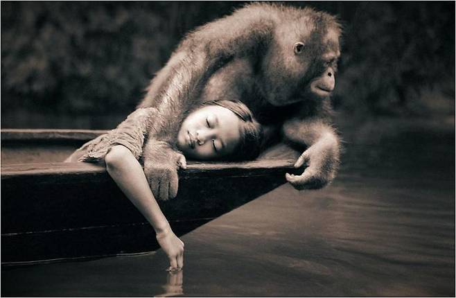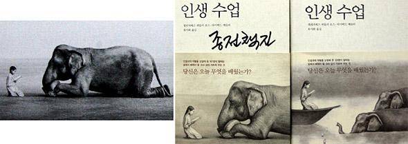 조그만 소녀와 거대한 코끼리가 서로 무릎 꿇고 앉아 마주보는 신비로운 모습. 이 표지의 힘으로 이 책은 엄청나게 많이 팔린 베스트셀러가 되었습니다. 하지만, 베껴도 너무 심하게 베꼈습니다. 원작 사진을 그대로 다시 그림으로 그린 것이었고, 바뀐 것이 있다면 사진 속에선 소년이 그림에선 소녀로 바뀐 것뿐이었습니다.