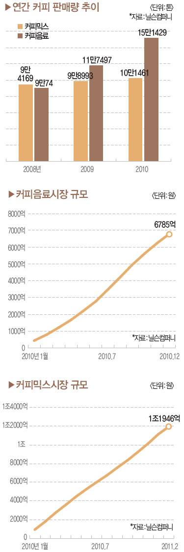 커피음료시장 성장세가 두드러진다. 시장조사전문업체 닐슨에 따르면 지난해 11월을 기준으로 커피믹스시장의 연간 판매량은 1조원을 넘어섰다.