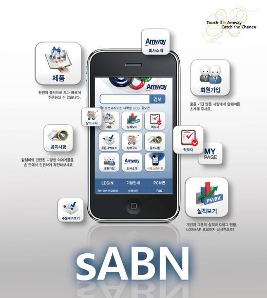 스마트폰 애플리케이션 'sABN' 서비스는 한국암웨이 공식 구매 사이트인 ABN의 주요 기능을 그대로 제공한다. 가장 활용도가 높은 제품, 퀵오더, 실적보기 등 9가지 항목을 메인화면에 배치해 스마트폰 환경에 익숙하지 않은 사용자들도 손쉽게 이용할 수 있도록 구성했다.