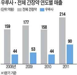 '간 때문이야~' 송을 히트시킨 대웅제약의 '우루사'는 의사의 처방 없이 살 수 있는 국내 일반의약품(OTC) 간장약 시장 규모를 지난해보다 36% 키웠다. 간장약의 전체 매출액이 올 1분기 215억원을 기록해 지난해 동기 대비 무려 57억원 늘어난 것이다. 물론 견인차는 우루사다. 우루사는 광고와 향상된 약효가 시너지 효과를 내면서 올해 1분기 90억원의 매출을 올렸다. 지난해 1분기(44억원)보다 두 배 이상 늘어난 수치다. 전체 간장약 시장에서의 점유율도 지난해 1분기 28.2%에서 올 1분기 42.1%로 13.9%포인트 증가했다. 이 덕에 대웅제약도 올해 1분기 매출액이 전년 동기 대비 6.6% 증가했다. 우루사를 제외한 기타 간장약 제품들의 매출은 124억원을 기록,전년 동기대비 9.2% 증가율로 역시 동반성장을 보였다. 우루사 한 제품의 선전으로 전체 시장 '파이'가 훌쩍 커진 셈이다.