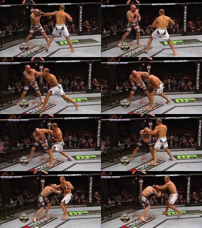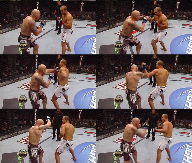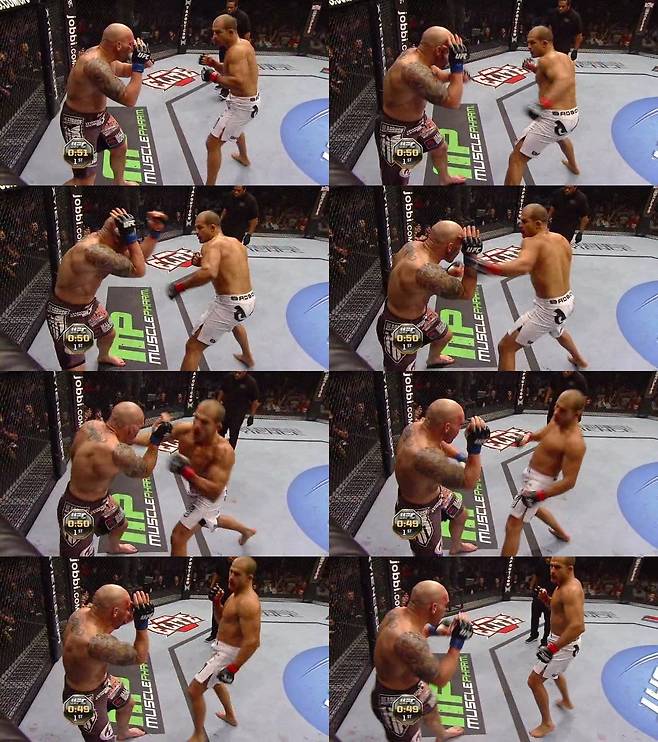 깜짝 놀란 카윈은 전진을 멈추고 뒤로 슬금슬금 빠진다. 또다시 피 냄새를 맡은 산토스가 다가와서 펀치를 날린다. 하지만 이 영리한 수사자 산토스는 그냥 단발로 타격을 날리지 않는다. 전사의 심장을 가진 카윈이 그 순간 받아칠 수 있다는 걸 본능적으로 알고 있다. 이럴 때 일류 타격가들은 속여주고 얼러 줘서 상대 카운터 타격을 미리 끌어내든지, 상대 몸을 방어 태세로 얼어붙게 만들어 반격을 못하도록 만든 후 때린다. 2~3번 사진을 보면 산토스가 한번 왼손을 날릴 듯 귀신같이 페이크 모션을 주는 게 보인다. 그리고 4번 사진에서 레프트 훅을 날리는데, 이건 거의 훅이 아니라 두드리는 모션 정도다. 옆으로 한 번 '팡!'하고 빠르게 주고 벌어진 커버링 사이로 5번 사진에서처럼 라이트 스트레이트를 재빨리 찔러 넣기 위한 동작이다. 그리고는 6~8번 사진에서 보듯 카윈의 반격을 경계해 또다시 뒤로 빠진다. 카윈은 한 마디로 속수무책이다.