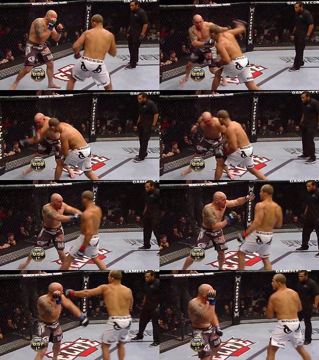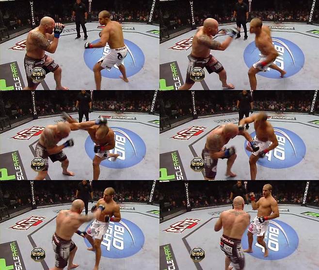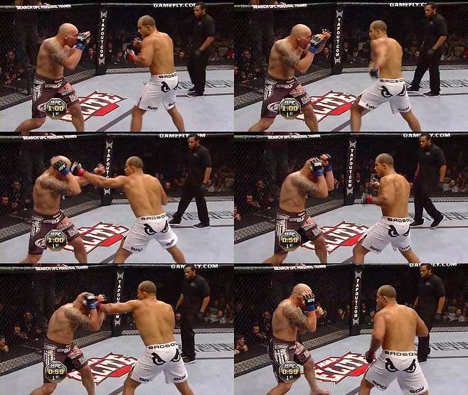 라이트 스트레이트를 얻어맞은 카윈이 오른쪽으로 돌자 산토스는 1번 사진에서 왼손 훅으로 그 길목을 막아준다. 상대가 좌우로 움직이는 길목을 능숙히 막아놓는 모습에서 다시 한 번 마이크 타이슨이 오버랩된다. 레프트 훅에 걸려 길목이 막힌 카윈은 멈춰 서게 되고, 산토스는 그 순간을 놓치지 않고 라이트를 치고 들어간다. 그 다음 4~6번 사진을 보라. 위에서 설명한 것과 마찬가지로, 산토스의 몸이 완전히 사각으로 빠져 있지 않나. 이미 옆으로 쭉 빠져 있기에, 카윈의 펀치는 닿지 않고 산토스의 레프트 훅은 꽂히는 각도가 완성되어 있다. 이 장면에서 카윈은 쓰러졌고 파운딩을 잔뜩 얻어맞고는 피범벅이 되어 버렸다. 그 후 2~3라운드에서 카윈은 남다른 투지를 보여 주긴 했지만, 타격에서는 산토스에게 몇 수 아래란 사실을 확인하며 패배의 쓴맛을 봐야 했다.