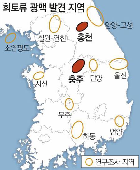 충북 충주시와 강원 홍천군에서 우리나라가 최소 30년, 최대 50년 가까이 사용할 수 있는 '희토류' 광맥이 발견됐다. 이를 개발하면 전량 수입(연간 3000t 규모)에 의존하는 희토류를 대체할 수 있어 세계 생산량의 97%를 독점하는 중국의 영향력을 줄일 것으로 기대된다.