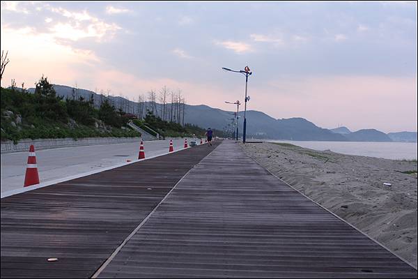 모래밭을 따라 이어지는 해안도로 옆에는 데크를 깔아 산책하기 좋게 해놓았다. 산책하기만 좋은가, 쉬었다 가기에도 좋다. 배낭을 내려놓고 바다를 향해 앉았다. 신발을 벗고, 양말까지 벗은 뒤 발가락을 꼬물거리면서 석양이 물들기 시작하는 바다를 바라보는 느낌, 끝내준다.