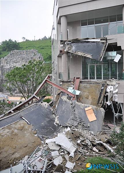 【용인=뉴시스】강종민 기자 = 4일 오전 경기 용인 기흥구 영덕동 34층 아파트형 공장의 주건물과 부속건물을 잇는 15m 길이의 2층 연결통로가 무너져 내리는 사고가 발생했다. 그러나 인명피해는 없었다. (사진=경기소방재난본부 제공)
