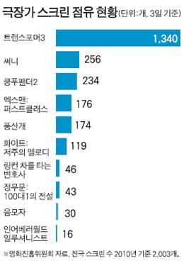 지난달 29일 개봉한 '트랜스포머3'가 3일까지 첫 주 흥행 역대 최고 기록인 305만4,034명(영화진흥위원회 집계)을 불러 모으며 스크린 싹쓸이 논란이 불거지고 있다. 1,251개 스크린에서 첫 선을 보인 '트랜스포머3'는 3일 1,340개 스크린을 점령하며 올해 최고치를 기록했다. 전국 스크린(2010년 기준 2,003개)의 66.9%에 해당하는 숫자다.